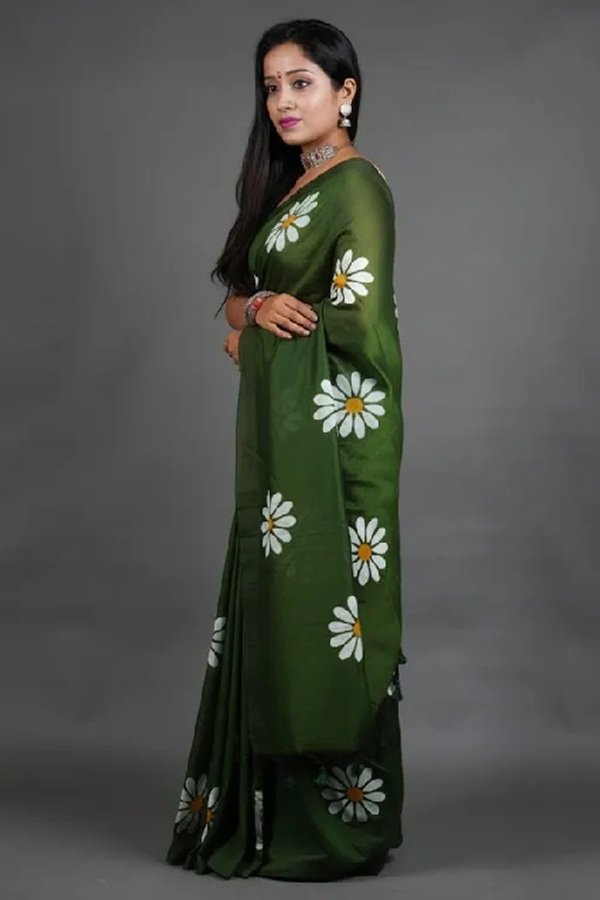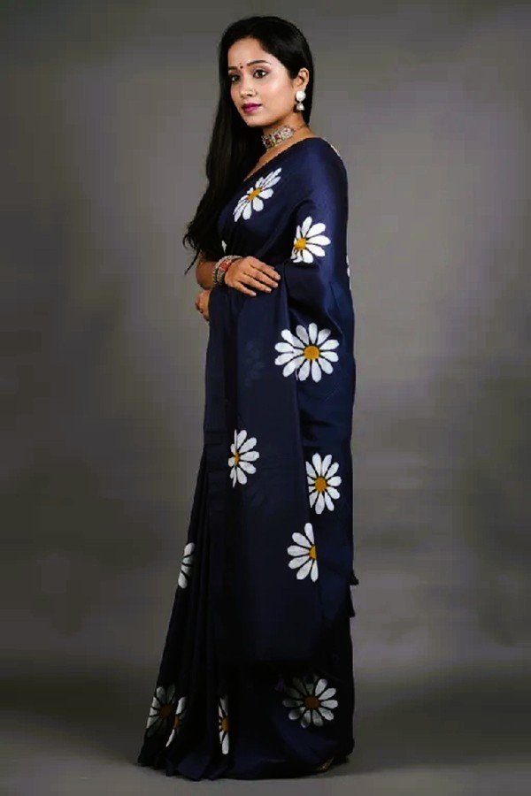 Shop our stunning black mul cotton handpainted saree with delicate white daisy prints. Experience comfort and style…