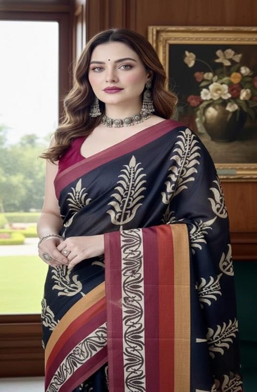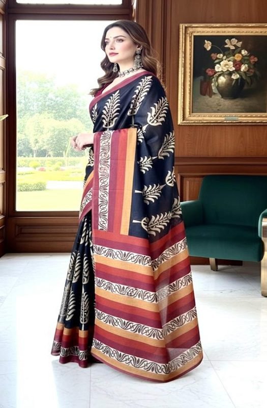 Designed for the professional woman, this drape offers a look of understated luxury. It is crafted from authentic Bhagalpuri silk, famous for its rich, matte texture and lightweight feel. The natural black body serves as a canvas for intricate vertical leaf prints that beautifully depict scenes of nature. A vibrant red and ocher border frames the saree, adding a sophisticated pop of color to the beautiful tones.