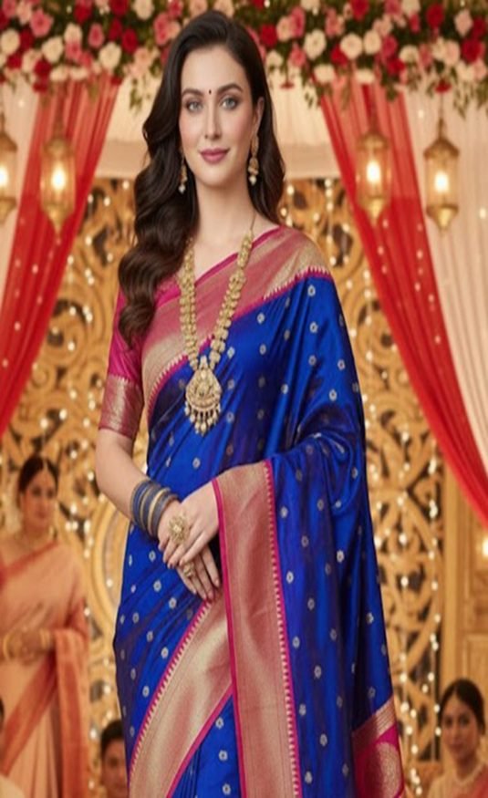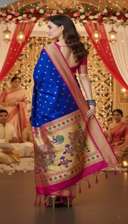 Explore the exquisite luster of this soft royal blue kalanjali paithani saree, featuring delicate gold zari work and a luxurious sheen. this look is perfect for weddings and sophisticated festive gatherings.