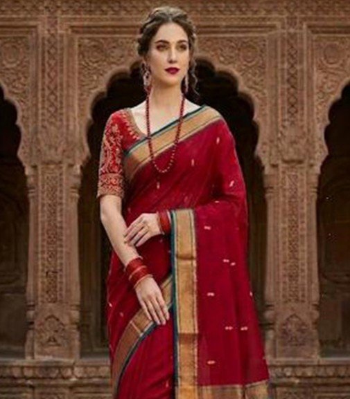 The body of this Red and Teal Blue Maheshwari Cotton Silk Saree is a deep, sophisticated with a delicate semi-transparent texture. It is elegantly scattered with hand-woven golden flower buttas that catch the light with every movement. The true focal point is the traditional Golden Zari Chatai Border is a commitment to quality and the. This intricate “mat-weave” pattern leads into a magnificent contrast tealblue pallu, richly adorned with heritage zari stripes and finished with hand-tied tassels.